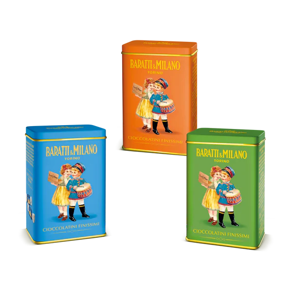 Baratti Milano historische blikjes gevuld met chocolade 50 g (12 per doos)