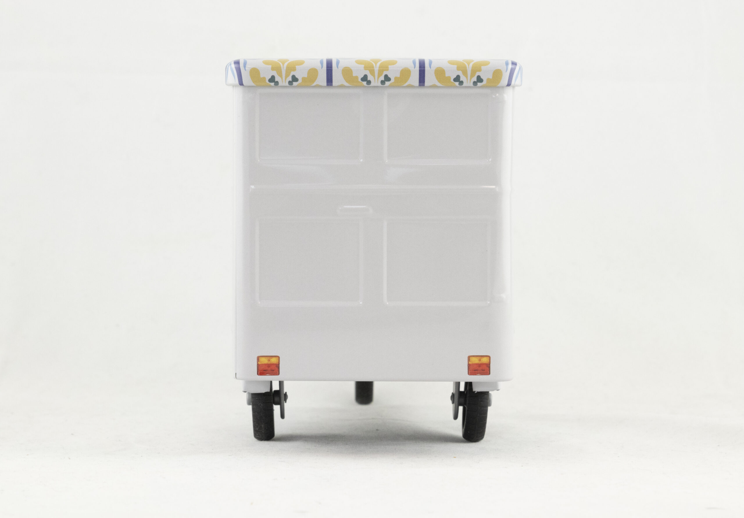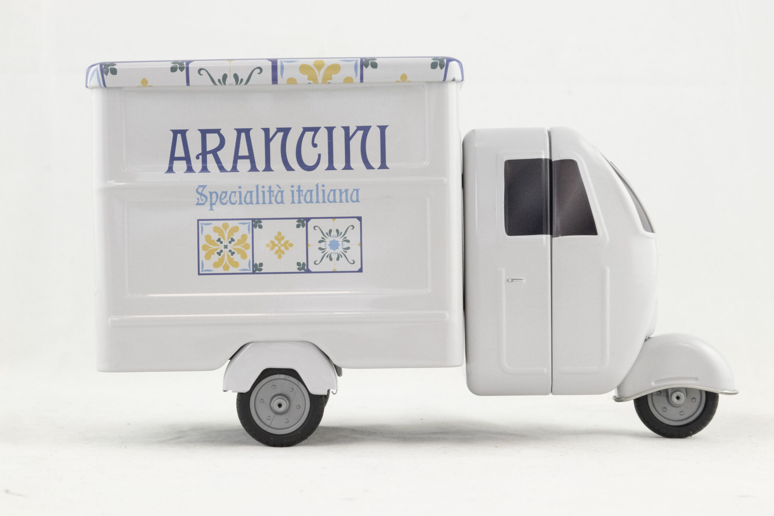 Het Piaggio Ape koekblik met arancini-design combineert authenticiteit met elegantie. Het blikje ademt Italiaanse sfeer uit en nodigt uit tot ontdekken, ideaal voor het presenteren van delicate producten zoals cannoli, amaretti of andere zoetigheden.