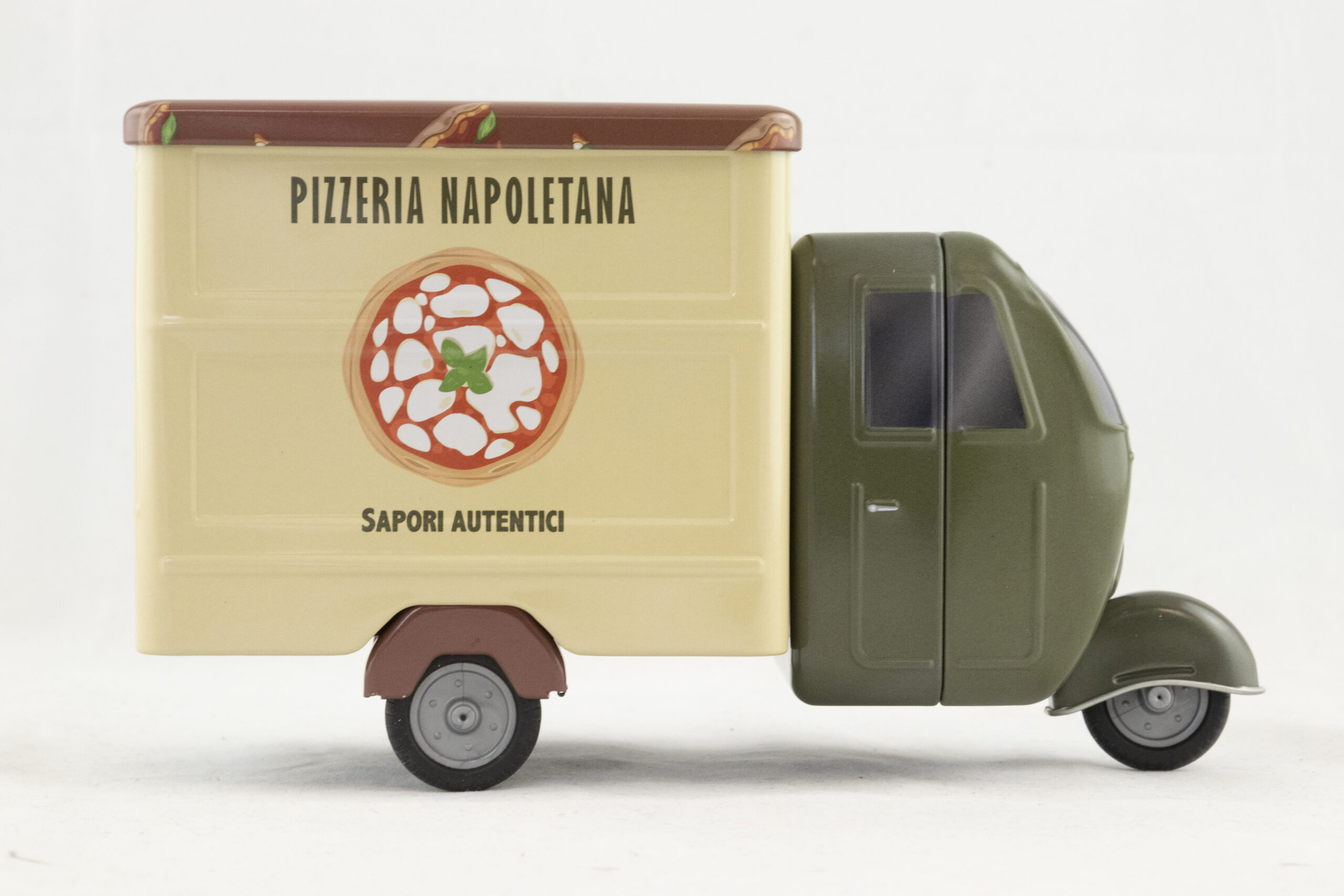 Breng een stukje Italiaanse straatcultuur naar uw klanten met ons Piaggio Ape koekblik, geïnspireerd op de wereldberoemde pizza. Het iconische design van de Piaggio Ape, compleet met vrolijke kleuren en authentieke details, trekt direct de aandacht en nodigt uit om ontdekt te worden.